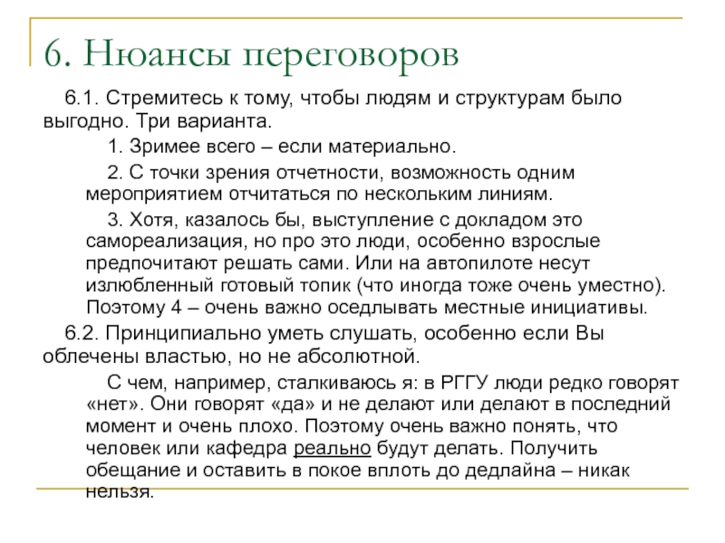 6.2. Принципиально уметь слушать, особенно если Вы облечены властью, но не абсолютной.