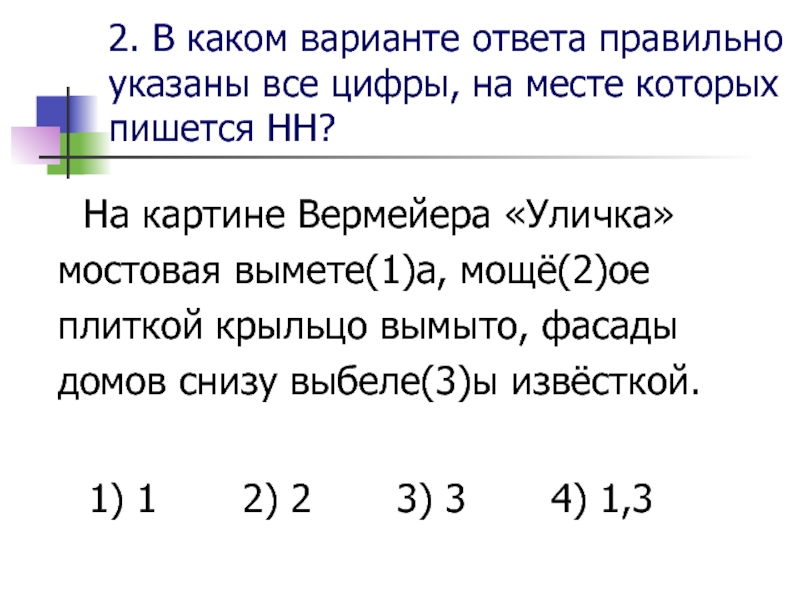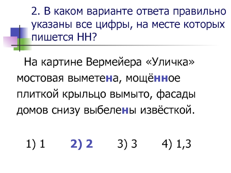 На картине Вермейера «Уличка» мостовая вымете(1)а, мощё(2)ое плиткой крыльцо вымыто, фасады домов снизу выбеле(3)ы извёсткой.