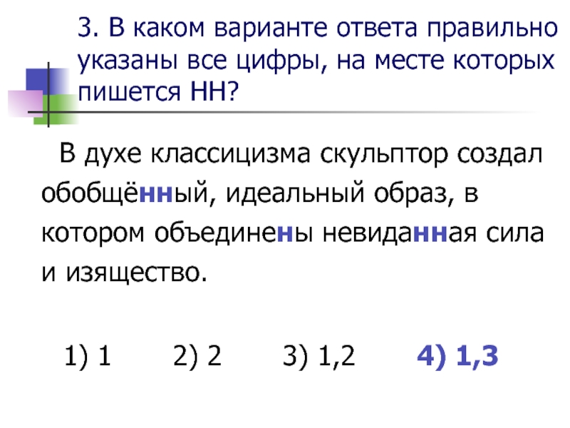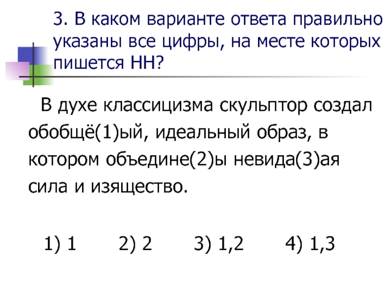 В духе классицизма скульптор создал обобщё(1)ый, идеальный образ, в котором объедине(2)ы невида(3)ая сила и изящество.