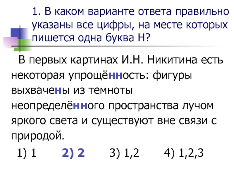 В первых картинах И.Н. Никитина есть некоторая упрощё(1)ость: фигуры выхваче(2)ы из темноты неопределё(3)ого пространства лучом яркого света и существуют вне связи с природой.