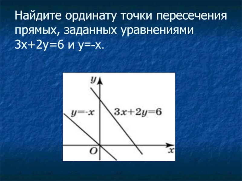 Слайд 11Найдите ординату точки пересечения прямых, заданных уравнениями 3x+2y=6 и y=-x.