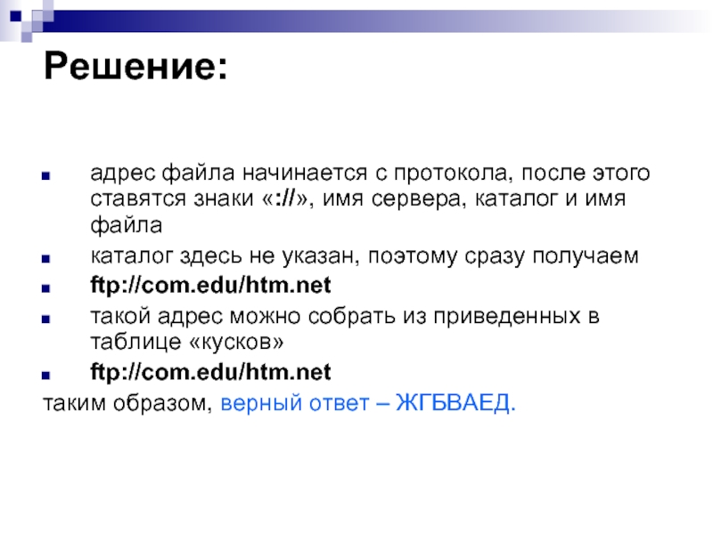 протоколу ftp. В таблице фрагменты адреса файла закодированы буквами от А до Ж. Запишите последовательность этих букв, кодирующую адрес указанного файла в сети Интернет.