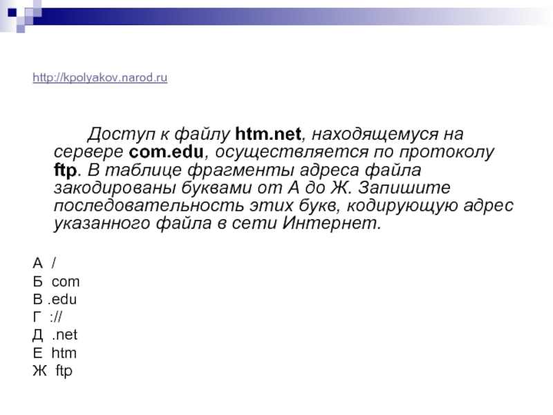 по протоколу http. В таблице фрагменты адреса файла закодированы буквами от А до Ж. Запишите последовательность этих букв, кодирующую адрес указанного файла в сети Интернет.