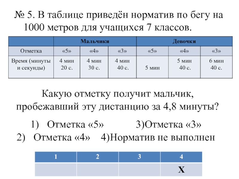 Какую отметку получит мальчик, пробежавший эту дистанцию за 4,8 минуты?