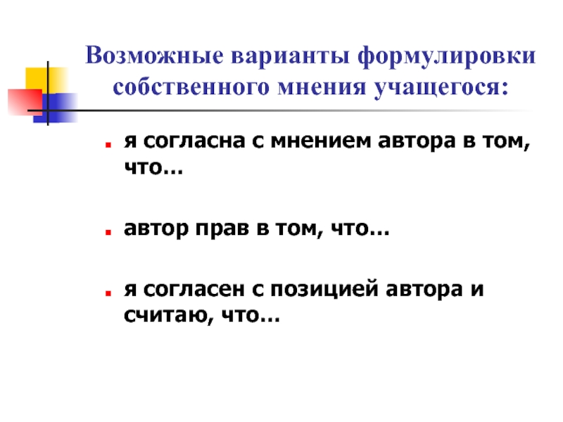 Слайд 14Возможные варианты формулировки собственного мнения учащегося: