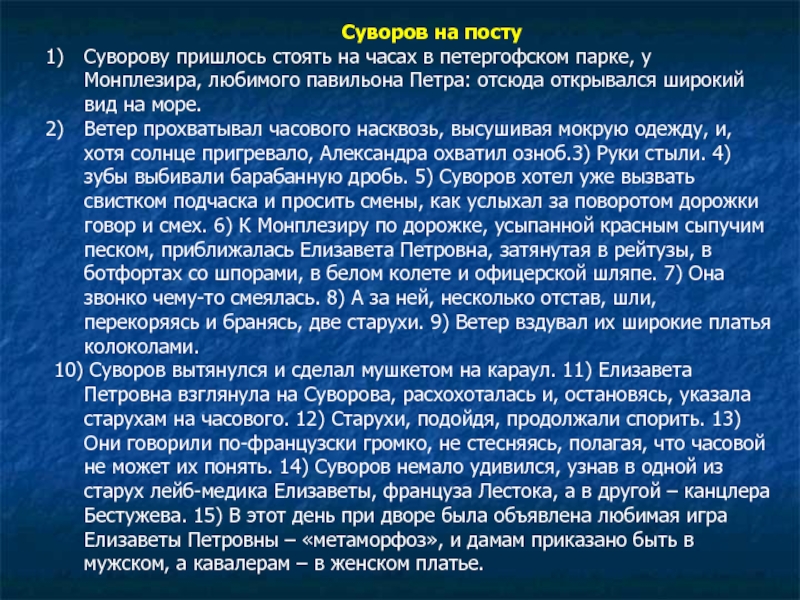 10) Суворов вытянулся и сделал мушкетом на караул. 11) Елизавета Петровна взглянула на Суворова, расхохоталась и, остановясь, указала старухам на часового. 12) Старухи, подойдя, продолжали спорить. 13) Они говорили по-французски громко, не стесняясь, полагая, что часовой не может их понять. 14) Суворов немало удивился, узнав в одной из старух лейб-медика Елизаветы, француза Лестока, а в другой – канцлера Бестужева. 15) В этот день при дворе была объявлена любимая игра Елизаветы Петровны – «метаморфоз», и дамам приказано быть в мужском, а кавалерам – в женском платье.