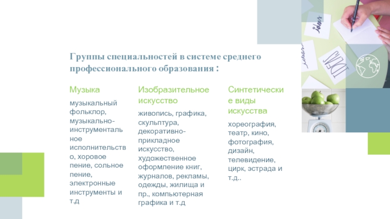 хореография, театр, кино, фотография, дизайн, телевидение, цирк, эстрада и т.д..