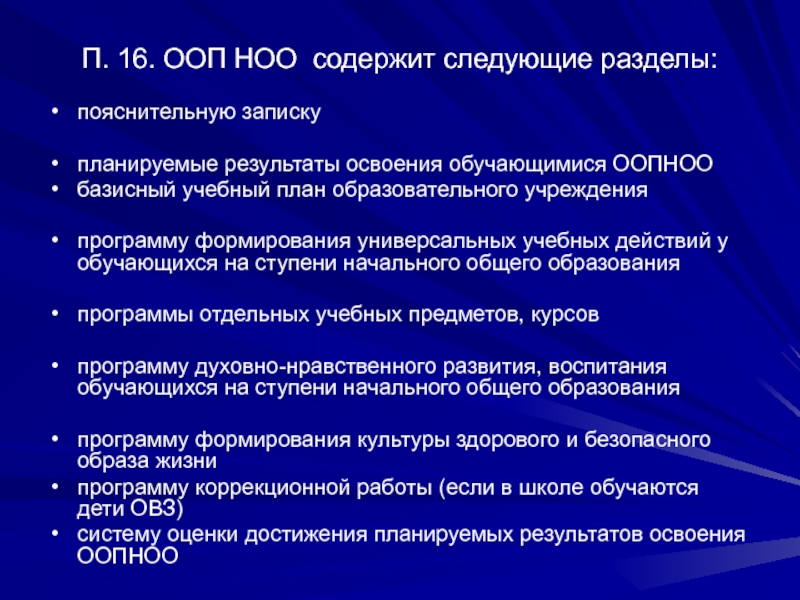 Слайд 3П. 16. ООП НОО содержит следующие разделы: