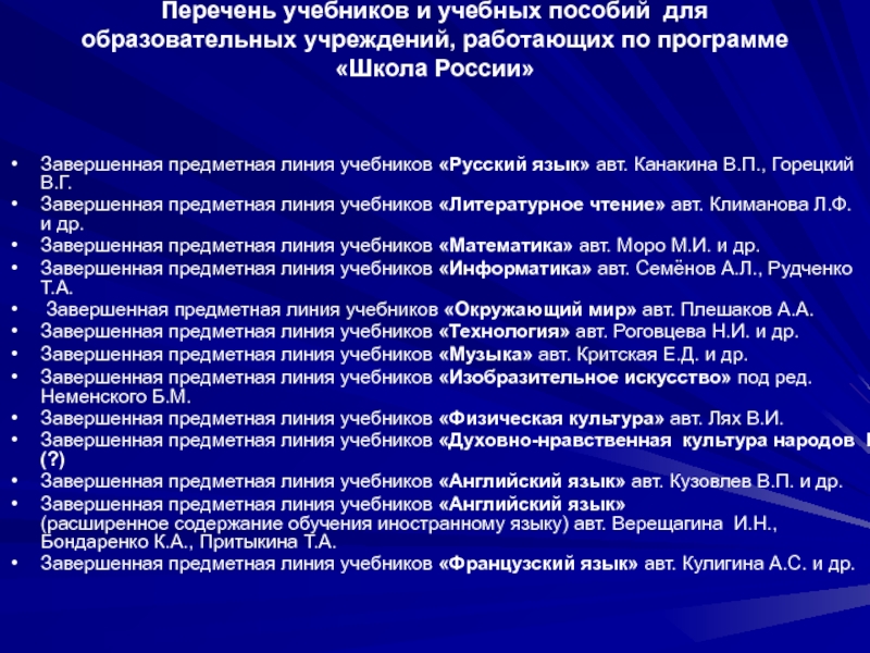 Слайд 20Перечень учебников и учебных пособий для образовательных учреждений, работающих по программе