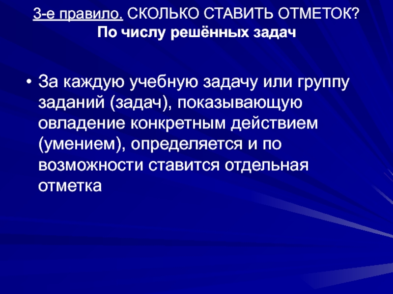 3-е правило (Одна задача – одна оценка) − используется полностью. Учитель и ученики привыкают оценивать каждую решённую задачу в отдельности. Если требуется определить одну отметку за контрольную или за урок, это делается на основе отдельных отметок за решённые задачи (например, среднее арифметическое).