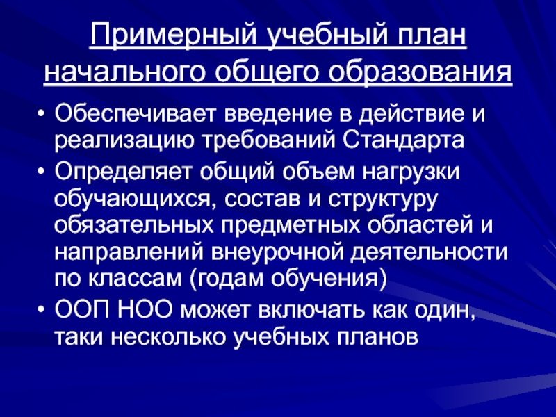 Определяет общий объем нагрузки обучающихся, состав и структуру обязательных предметных областей и направлений внеурочной деятельности по классам (годам обучения)