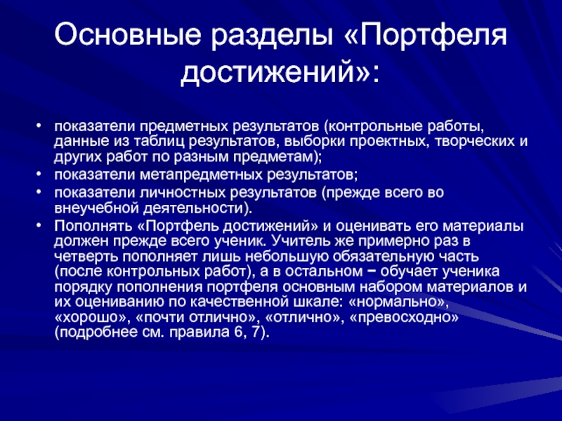 Пополнять «Портфель достижений» и оценивать его материалы должен прежде всего ученик. Учитель же примерно раз в четверть пополняет лишь небольшую обязательную часть (после контрольных работ), а в остальном − обучает ученика порядку пополнения портфеля основным набором материалов и их оцениванию по качественной шкале: «нормально», «хорошо», «почти отлично», «отлично», «превосходно» (подробнее см. правила 6, 7).