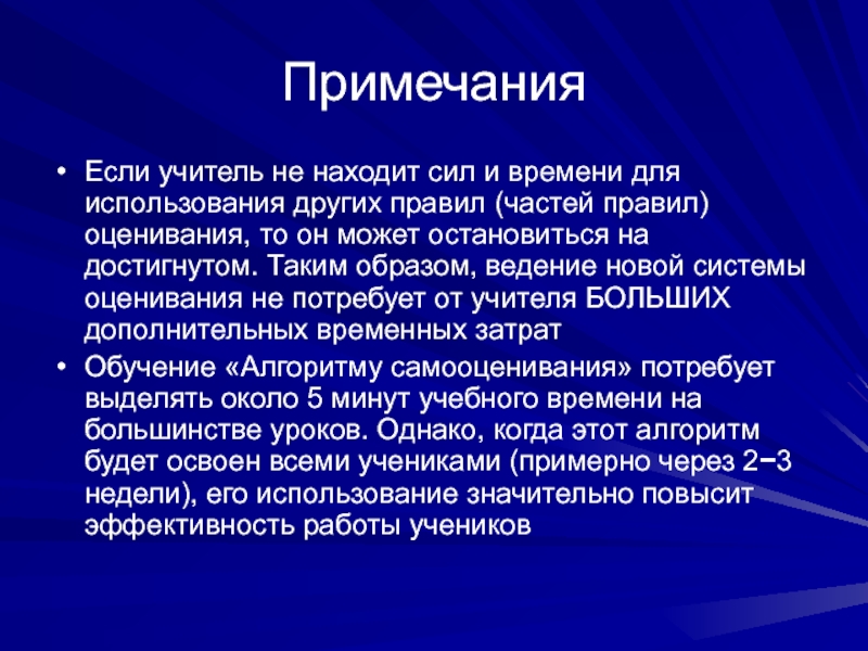 Обучение «Алгоритму самооценивания» потребует выделять около 5 минут учебного времени на большинстве уроков. Однако, когда этот алгоритм будет освоен всеми учениками (примерно через 2−3 недели), его использование значительно повысит эффективность работы учеников