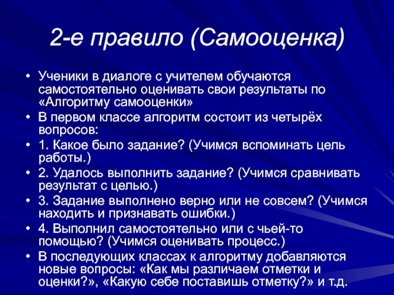 Ученики в диалоге с учителем обучаются самостоятельно оценивать свои
