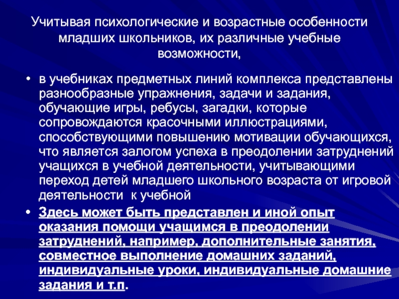 разброс в темпах и направлениях развития детей, индивидуальные различия в их познавательной деятельности, восприятии, внимании, памяти, мышлении, речи, моторике и т. д. (описать разнообразные технологии, формы и методы с учетом личностно-ориентированного образования), связанные с возрастными, психологическими и физиологическими индивидуальными особенностями детей младшего школьного возраста