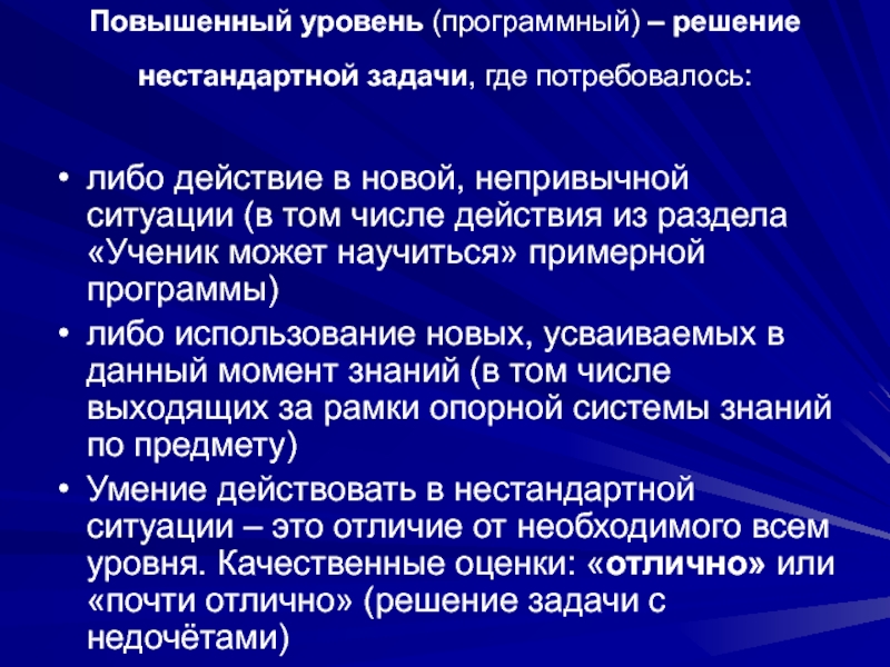 Умение действовать в нестандартной ситуации – это отличие от необходимого всем уровня. Качественные оценки: «отлично» или «почти отлично» (решение задачи с недочётами)