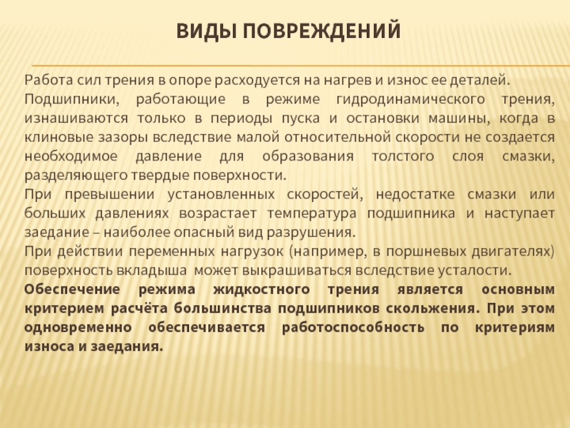 При превышении установленных скоростей, недостатке смазки или больших давлениях возрастает температура подшипника и наступает заедание – наиболее опасный вид разрушения.