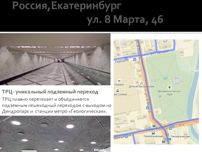ТРЦ плавно перетекает и объединяется подземным пешеходный переходом с выходом на Дендропарк и станции метро «Геологическая».