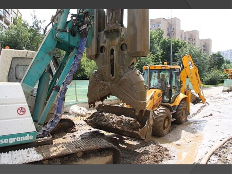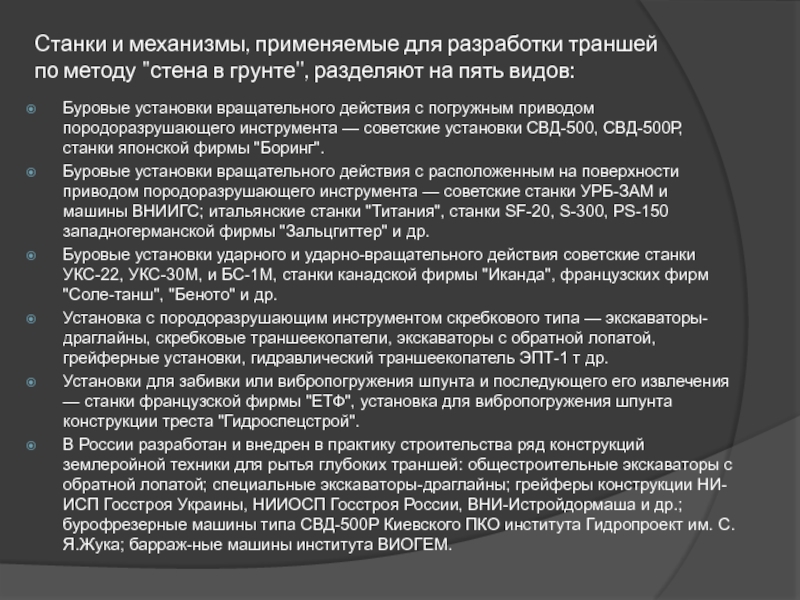 В России разработан и внедрен в практику строительства ряд конструкций землеройной техники для рытья глубоких траншей: общестроительные экскаваторы с обратной лопатой; специальные экскаваторы-драглайны; грейферы конструкции НИ-ИСП Госстроя Украины, НИИОСП Госстроя России, ВНИ-Истройдормаша и др.; бурофрезерные машины типа СВД-500Р Киевского ПКО института Гидропроект им. С.Я.Жука; барраж-ные машины института ВИОГЕМ.