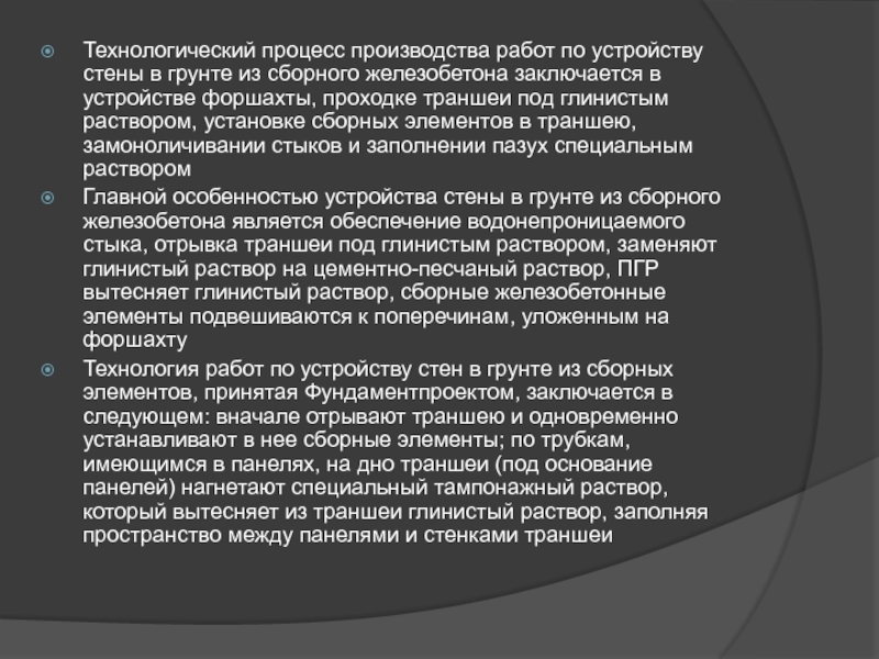 Главной особенностью устройства стены в грунте из сборного железобетона является обеспечение водонепроницаемого стыка, отрывка траншеи под глинистым раствором, заменяют глинистый раствор на цементно-песчаный раствор, ПГР вытесняет глинистый раствор, сборные железобетонные элементы подвешиваются к поперечинам, уложенным на форшахту