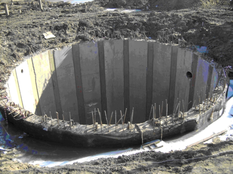 При возведении несущих стен из сборных железобетонных элементов их устанавливают в траншею, заполненную глинистым раствором. После монтажа конструкций он заменяется тампонажным раствором, который заполняет стыки панелей и застенное пространство и осуществляет передачу нагрузки на ограждение от массива грунта ненарушенной структуры.