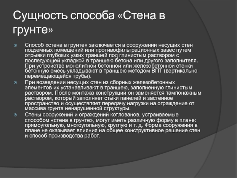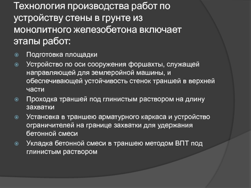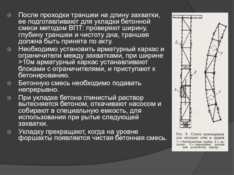 несущих стен подземных помещений или противофильтрационных завес путем отрывки глубоких узких траншей под глинистым раствором с последующей укладкой в траншею бетона или другого заполнителя. При устройстве монолитной бетонной или железобетонной стенки бетонную смесь укладывают в траншею методом ВПТ (вертикально перемещающейся трубы).