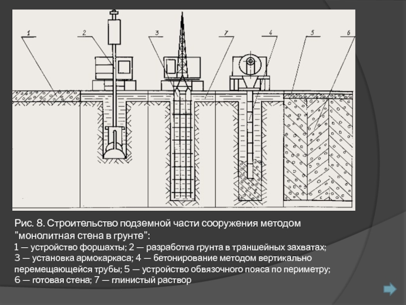 Слайд 13Рис. 8. Строительство подземной части сооружения методом "монолитная стена в грунте":