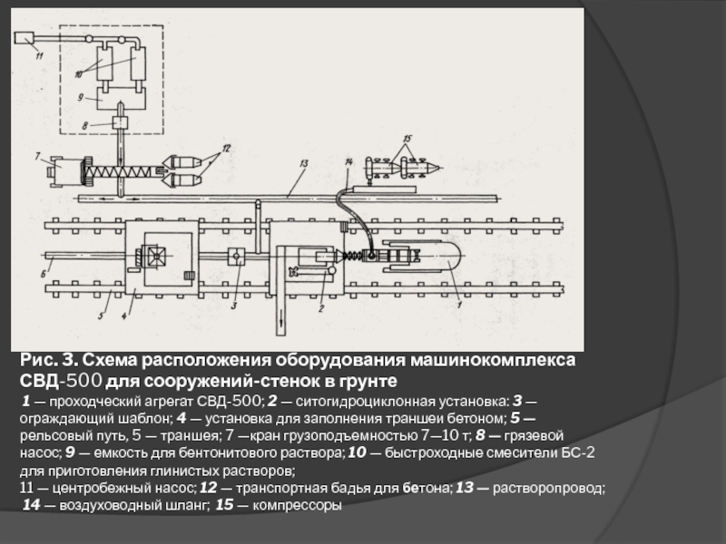Слайд 8Рис. 3. Схема расположения оборудования машинокомплекса СВД-500 для сооружений-стенок в грунте
