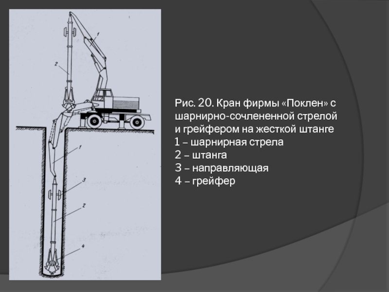 Слайд 28Рис. 20. Кран фирмы «Поклен» с шарнирно-сочлененной стрелой и грейфером на