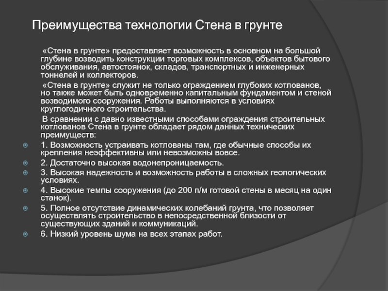 В сравнении с давно известными способами ограждения строительных котлованов Стена в грунте обладает рядом данных технических преимуществ: