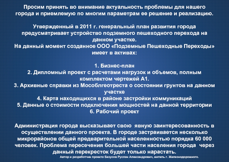 Строительство подземных пешеходных переходов в наиболее загруженных пешеходным траффиком автодорожных перекрестков является перспективным развитием строительства коммерческих площадей. Пешеходные переходы, построенные на коммерческой основе, позволят разгрузить федеральный бюджет на благоустройство дорог и во многом снять напряженность автомобильного траффика в местах плотного пешеходного траффика, пересекающего автотрассу.