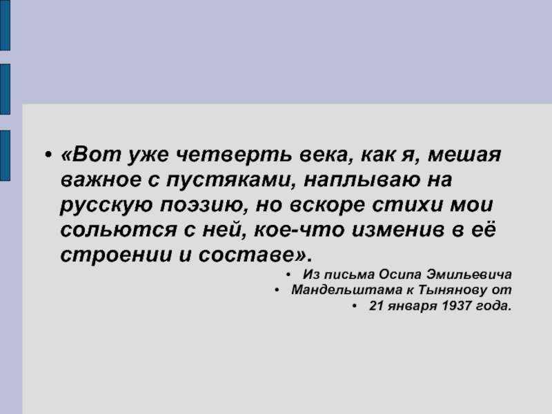 на русскую поэзию, но вскоре стихи мои сольются с ней, кое-что изменив в её строении и составе».