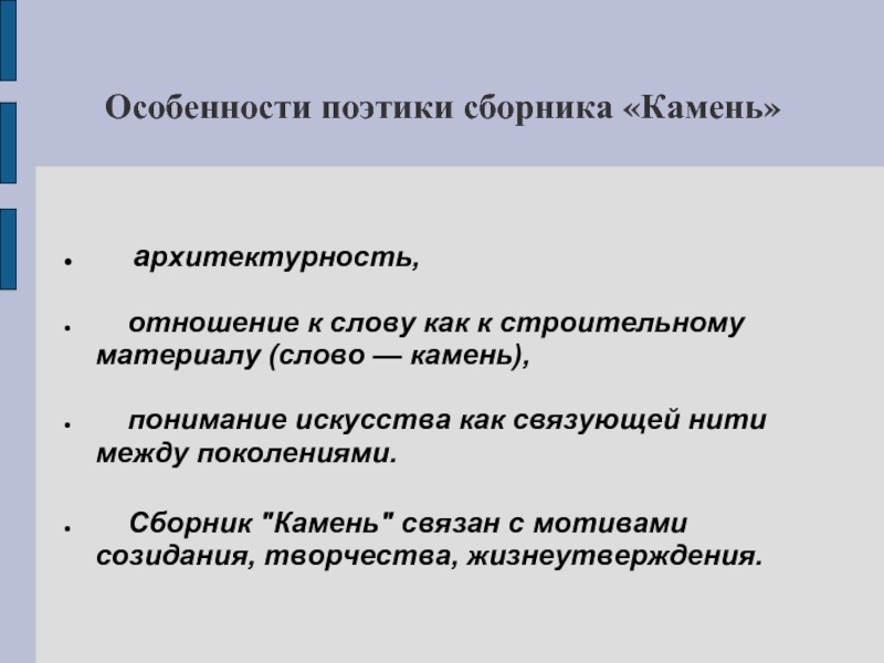 Сборник "Камень" связан с мотивами созидания, творчества, жизнеутверждения.