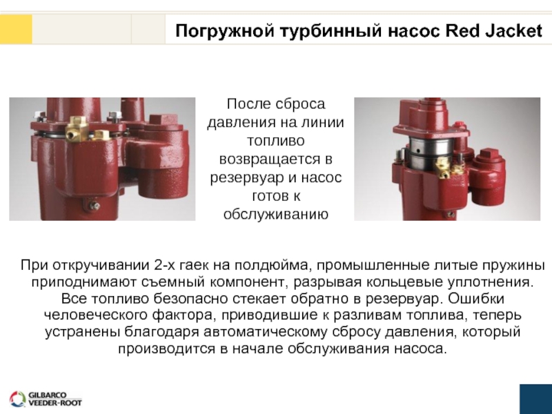 При откручивании 2-х гаек на полдюйма, промышленные литые пружины приподнимают съемный компонент, разрывая кольцевые уплотнения. Все топливо безопасно стекает обратно в резервуар. Ошибки человеческого фактора, приводившие к разливам топлива, теперь устранены благодаря автоматическому сбросу давления, который производится в начале обслуживания насоса.