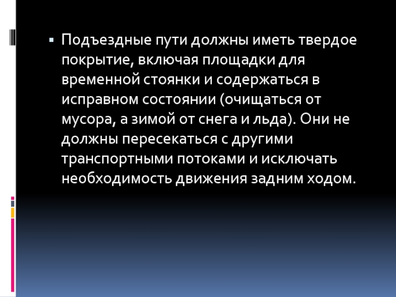 Слайд 10Подъездные пути должны иметь твердое покрытие, включая площадки для временной стоянки