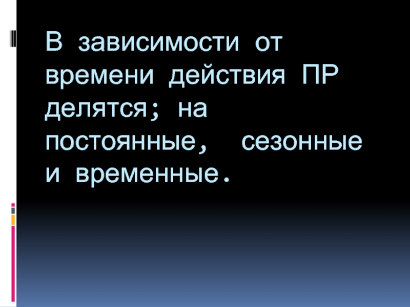 Слайд 2В зависимости от времени действия ПР делятся; на постоянные, сезонные и