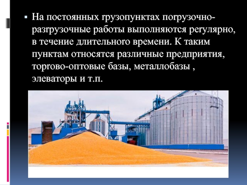 Слайд 3На постоянных rpузопунктах поrpузочно-разrpузочные работы выполняются реryлярно, в течение длительноrо времени.