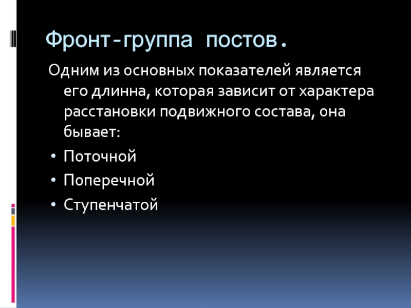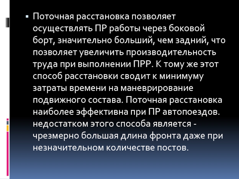 чем задний, что позволяет увеличить производительность труда при выполнении ПРР. К тому же этот способ расстановки сводит к минимуму затраты времени на маневрирование подвижного состава. Поточная расстановка наиболее эффективна при ПР автопоездов. недостатком этого способа является -чрезмерно большая длина фронта даже при незначительном количестве постов.