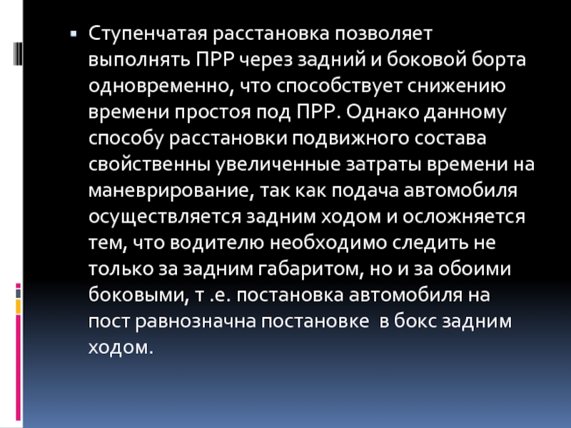 что способствует снижению времени простоя под ПРР. Однако данному способу расстановки подвижного состава свойственны увеличенные затраты времени на маневрирование, так как подача автомобиля осуществляется задним ходом и осложняется тем, что водителю необходимо следить не только за задним габаритом, но и за обоими боковыми, т .е. постановка автомобиля на пост равнозначна постановке в бокс задним ходом.