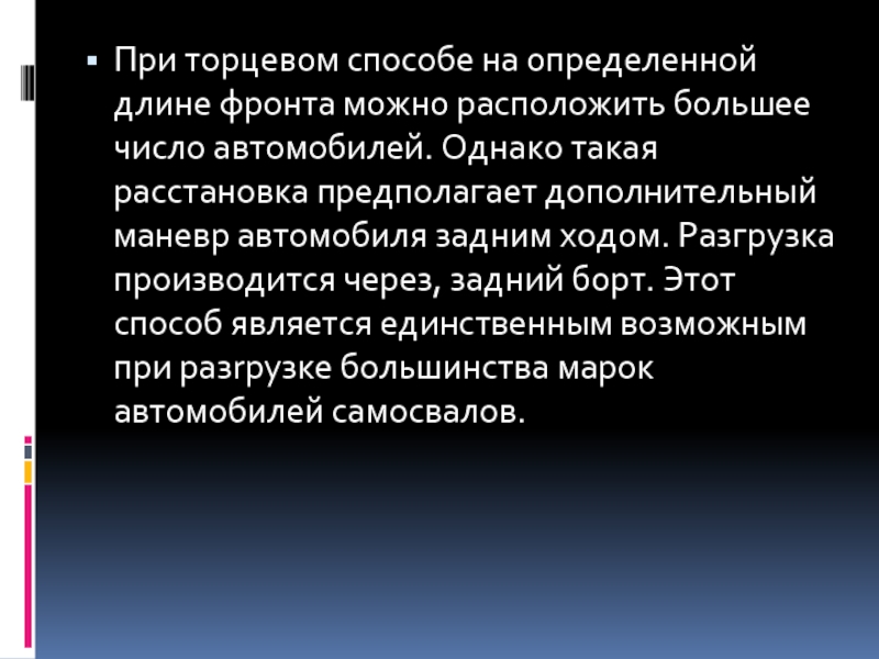 автомобилей. Однако такая расстановка предполагает дополнительный маневр автомобиля задним ходом. Разгрузка производится через, задний борт. Этот способ является единственным возможным при разrpузке большинства марок автомобилей самосвалов.