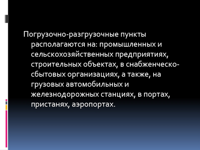 Слайд 7Погpузочно-разгpузочныe пункты располагаются на: промышленных и сельскохозяйственных предприятиях, строительных объектах, в