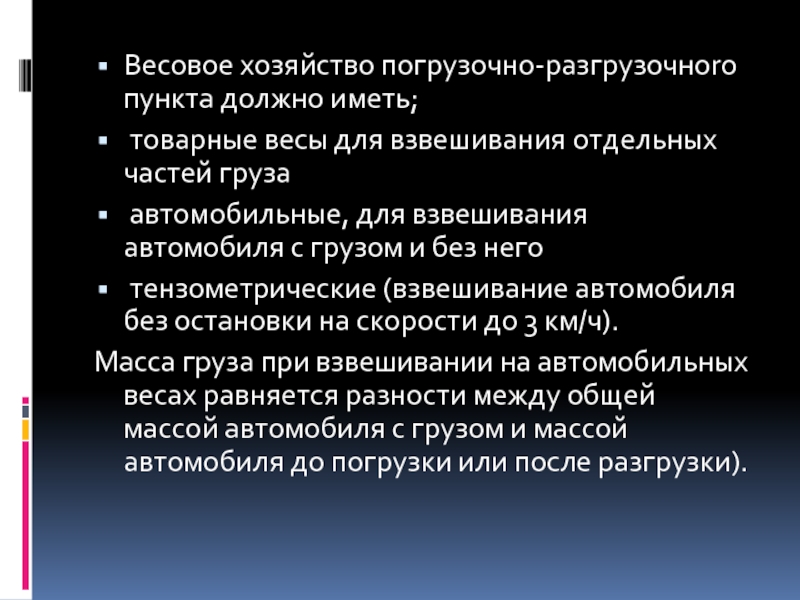 Слайд 9Весовое хозяйство погpузочно-разгpузочноrо пункта должно иметь;