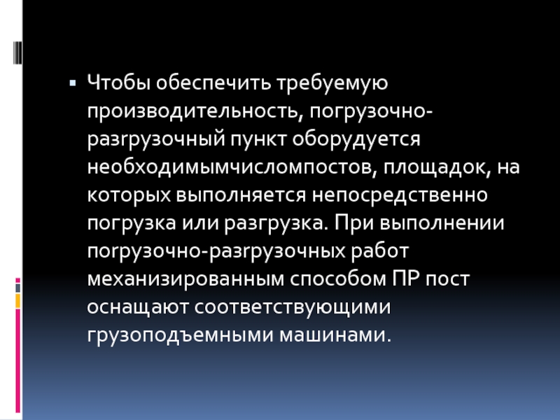 Слайд 11Чтобы обеспечить требуемую производительность, погрузочно-разrрузочный пункт оборудуется необходимымчисломпостов, площадок, на которых