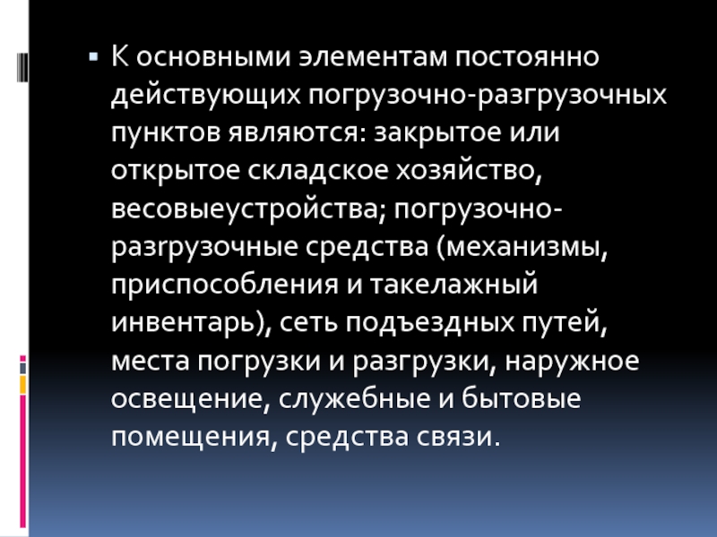 Слайд 8К основными элементам постоянно действующих погрузочно-разгpузочных пунктов являются: закрытое или открытое