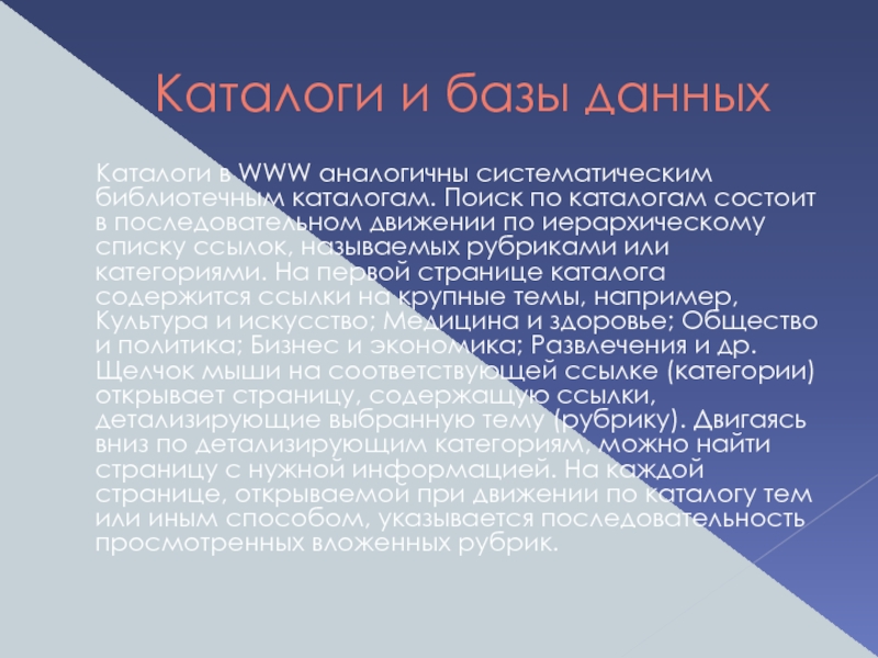 Каталоги в WWW аналогичны систематическим библиотечным каталогам. Поиск