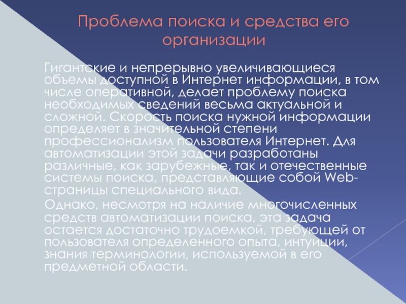 Однако, несмотря на наличие многочисленных средств автоматизации поиска, эта задача остается достаточно трудоемкой, требующей от пользователя определенного опыта, интуиции, знания терминологии, используемой в его предметной области.