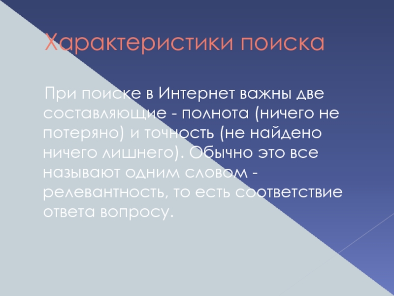 полнота (ничего не потеряно) и точность (не найдено ничего лишнего). Обычно это все называют одним словом - релевантность, то есть соответствие ответа вопросу.