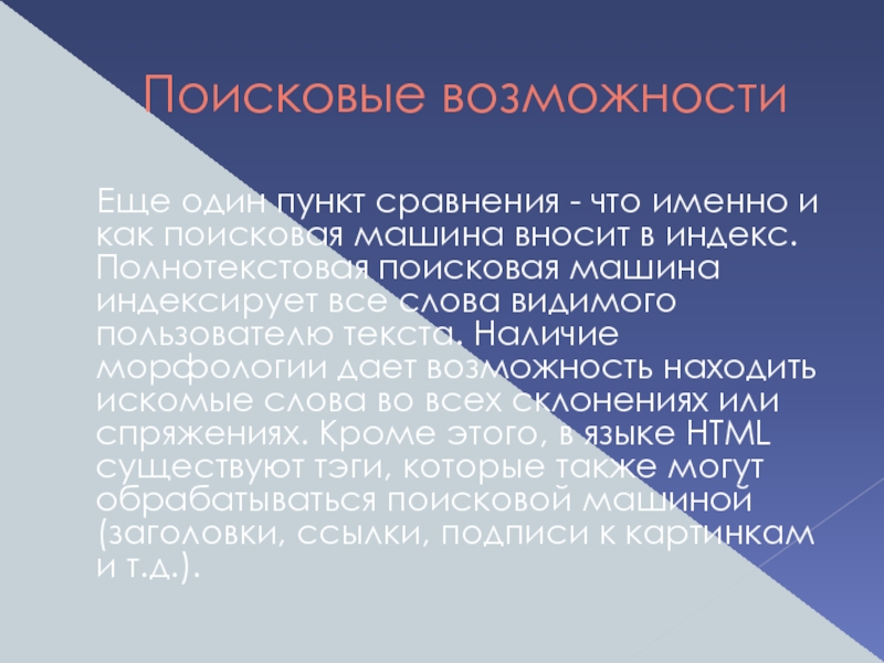 машина вносит в индекс. Полнотекстовая поисковая машина индексирует все слова видимого пользователю текста. Наличие морфологии дает возможность находить искомые слова во всех склонениях или спряжениях. Кроме этого, в языке HTML существуют тэги, которые также могут обрабатываться поисковой машиной (заголовки, ссылки, подписи к картинкам и т.д.).