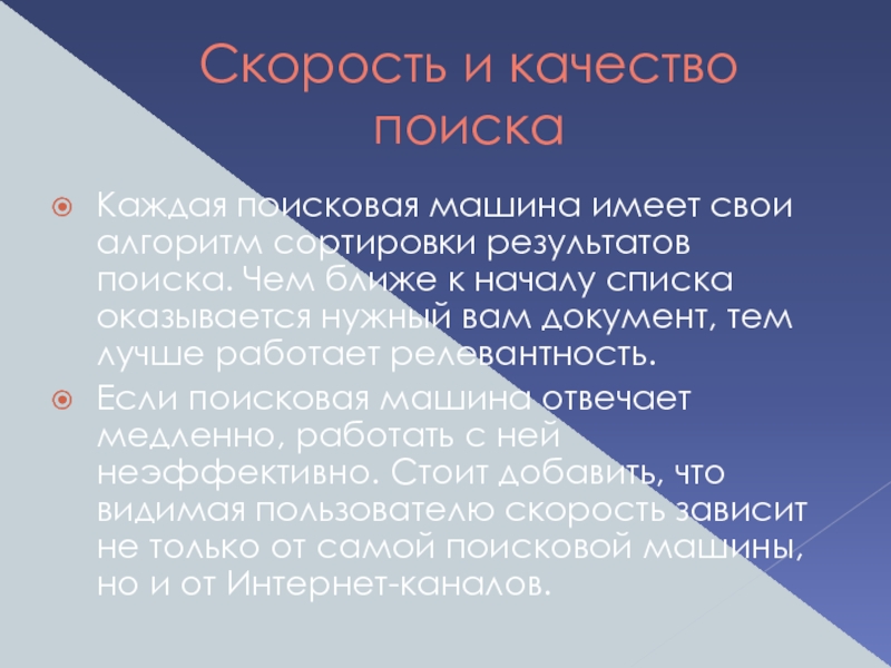 Если поисковая машина отвечает медленно, работать с ней неэффективно. Стоит добавить, что видимая пользователю скорость зависит не только от самой поисковой машины, но и от Интернет-каналов.