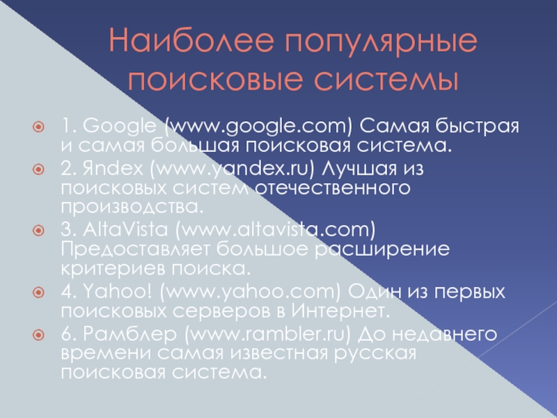 6. Рамблер (www.rambler.ru) До недавнего времени самая известная русская поисковая система.